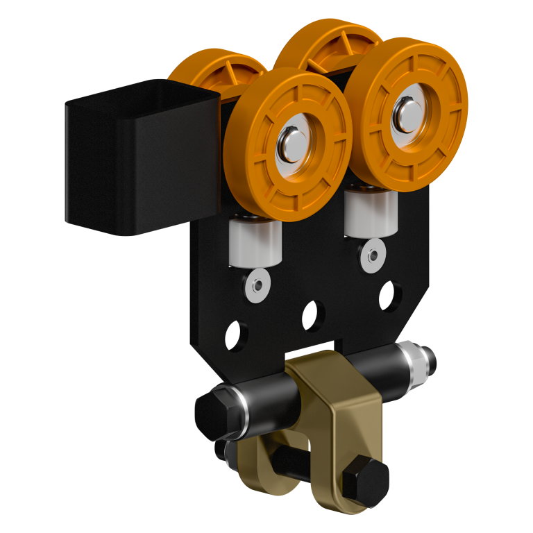 The EMRTA6192 Load Trolley with Yoke travels along a horizontal axis and suspends loads from the ERAD6000 Series rail system. The trolley’s yoke design allows for pivoting in the “X” and “Y” directions which creates freedom of movement. It attaches to the ERail’s conductor trolley.