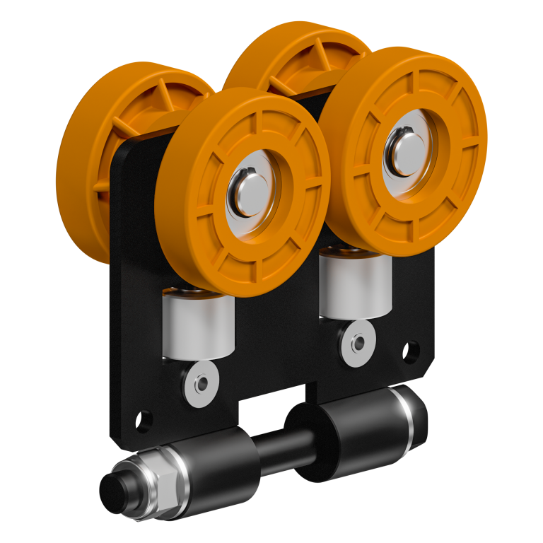 Knight Global’s MRTA6102 transfers loads along the horizontal axis and suspends Knight Torque Arms and fixtures from Knight’s RAD6110 Series Overhead Aluminum Rail Systems.