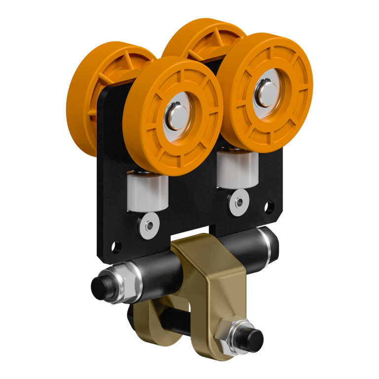 The MRTA6123 Low Profile Load Trolley with Yoke transfers loads along the horizontal axis and suspends Knight arm carriages and fixtures from Knight’s RAD6110 Series Overhead Aluminum Rail Systems.