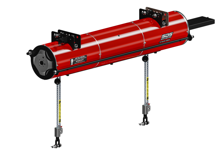 Knight has designed a “Dual Drum” Air Balancer with the patented Safety Drop Stop “SDS” dual chain feature. This type of Pneumatic Balancer is typically used in applications that require the manipulation of an unwieldy or large part. Also, a single suspension point may not stabilize a lengthy part. Some applications require that the fixture remain square to a part and (2) two hook points prevent fixture rotation.