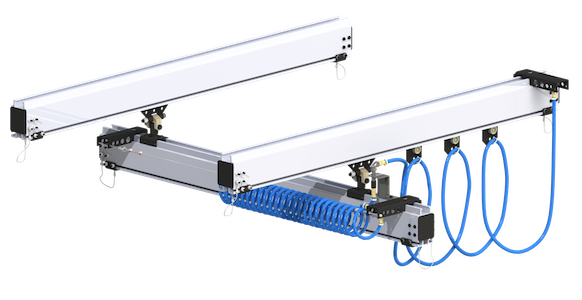 The Air Glide Hose Management System (patent pending) is a revolutionary solution to containing air hoses on the rail itself instead of hanging below. Using a reel and a channel that mounts alongside the rail, air hoses can be kept out of the way and are prevented from interfering with production in a plant setting. This exciting new product can also be integrated into existing systems as well as Jib Cranes.